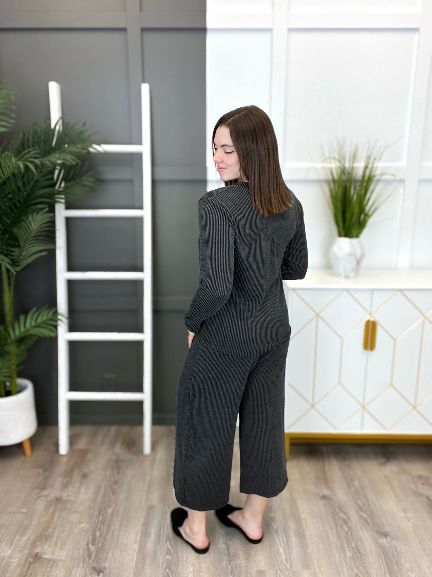 Women's Charcoal Long Sleeve Top & Pant Ribbed Lounge Set