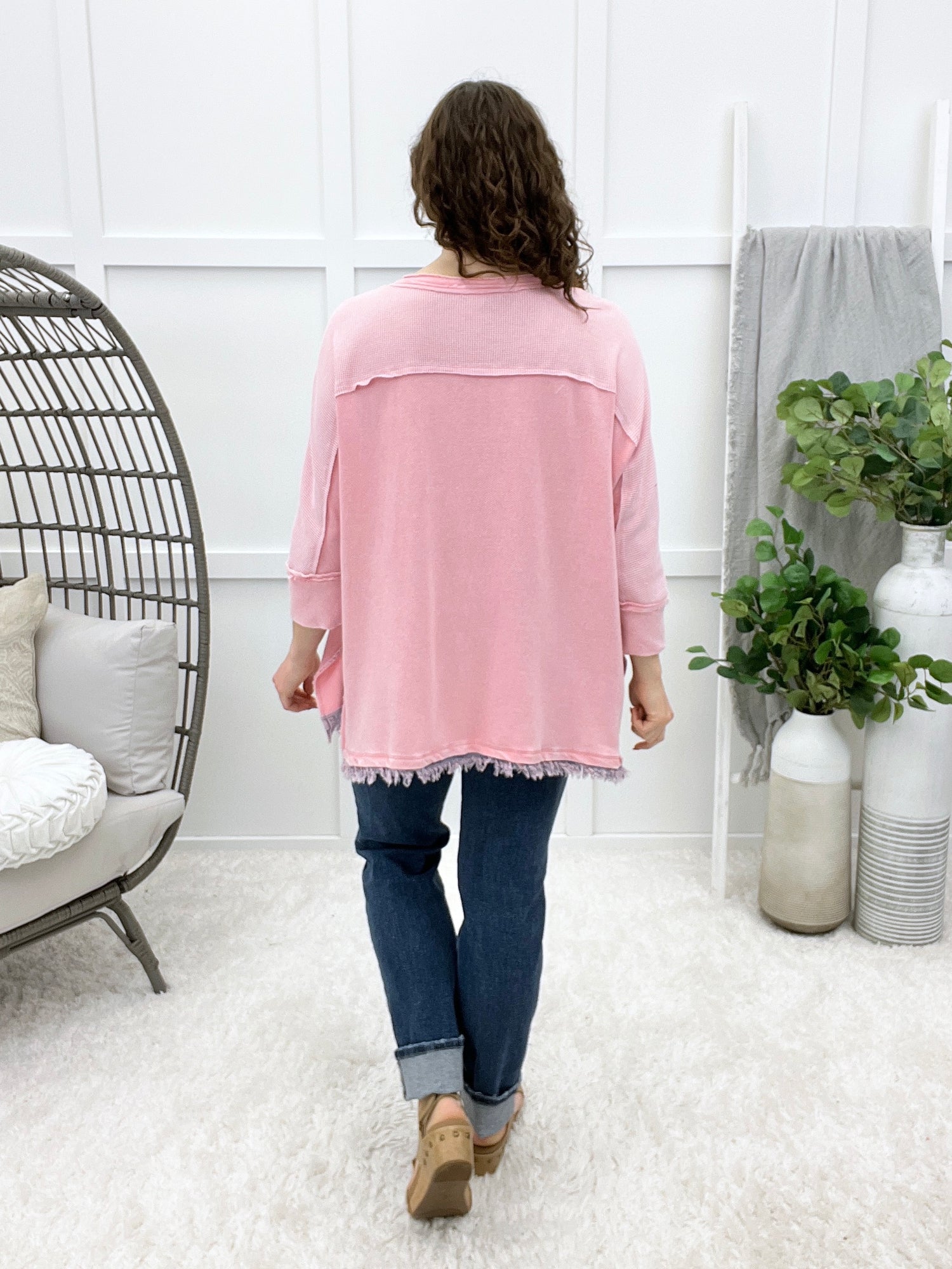 This washed waffle knit top brings cozy lounge vibes with a playful twist thanks to the oversized star patch and mixed fabric details on the front. Designed with a loose, relaxed fit, dropped shoulders, and easy 3/4 sleeves, it’s perfect for all-day comfort without sacrificing style. Pair it with shorts or denim for casual errands, travel days, or laid-back weekends.